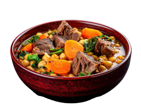 Hearty stew in a deep red bowl, featuring meat, chickpeas, spinach, and carrots