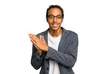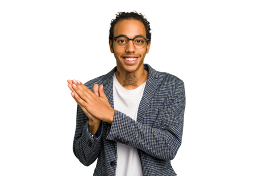 Young African American man isolated feeling energetic and comfortable, rubbing hands confident.