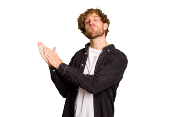 Young caucasian man isolated on green chroma background feeling energetic and comfortable, rubbing hands confident.