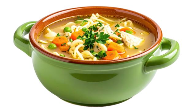 Creamy chicken vegetable soup with carrots, peas, potatoes, and parsley in a white bowl