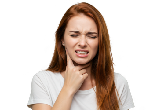 Brunette woman experiencing throat pain on transparent background