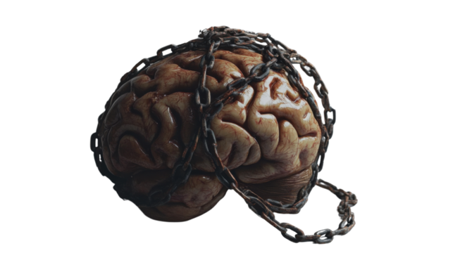 Hand bound by heavy chains representing restriction on transparent background