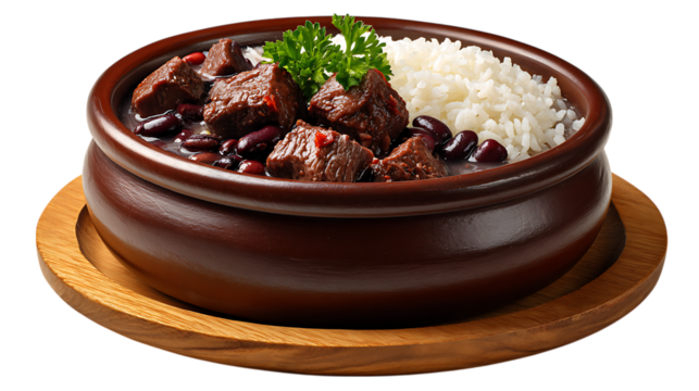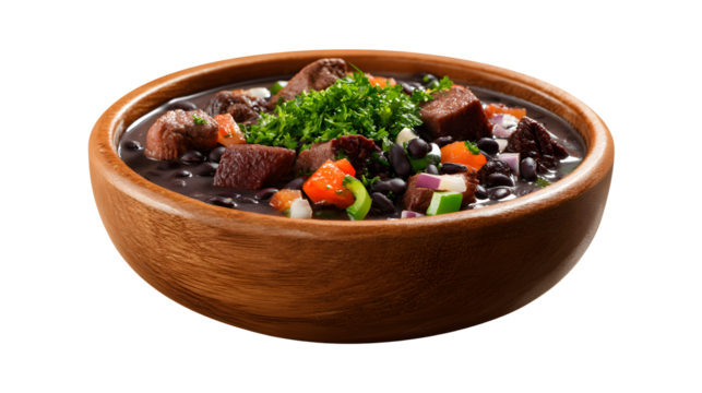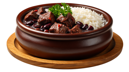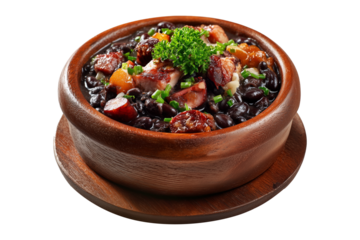 Delicious and hearty Brazilian feijoada stew served in a wooden bowl on transparent background