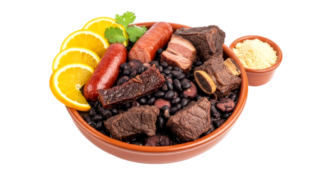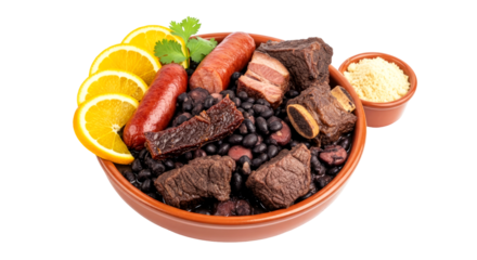 Traditional Brazilian feijoada dish with rice, black beans, beef chunks, stew pork and fresh orange slices in bowl isolated on white transparent background