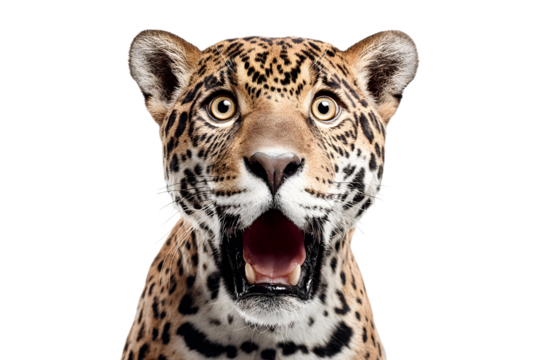 Surprised leopard with mouth open and big eyes isolated on transparent background