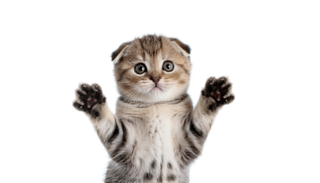 A playful kitten with lifted paws, showcasing curiosity and charm.