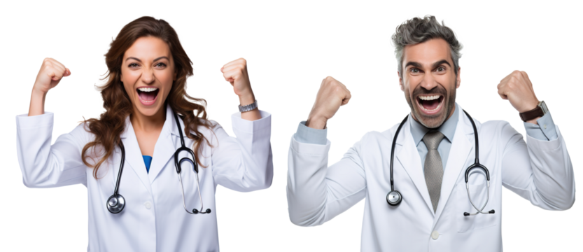 Happy young woman in pink blouse raising fists in excitement on white background. Isolated image expressing joy, success, and celebration. Ai generative