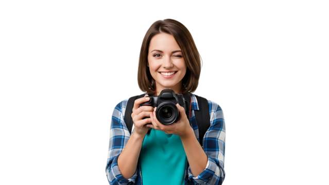 Smiling young female photographer holding a dslr camera, isolated on transparent background