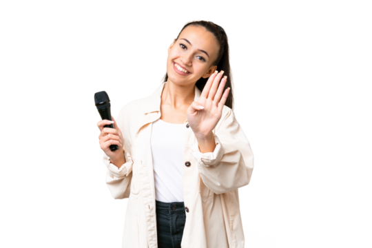 Young singer woman picking up a microphone over isolated chroma key background happy and counting four with fingers