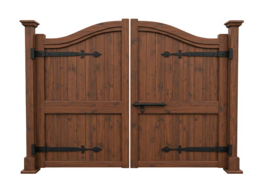 Brown wooden gate with black metal hinges and latch transparent background