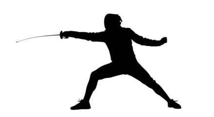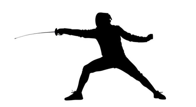 Swordsmen silhouettes in dynamic fencing pose on transparent background