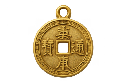 Traditional chinese wealth boat filled with gold coins isolated on transparent background. Gold coins under red house roof isolated on white background.