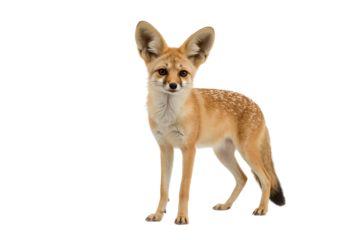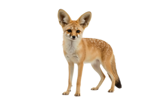 Adorable Fennec fox with large ears standing and looking at the camera, isolated on a white background