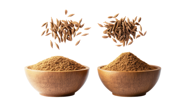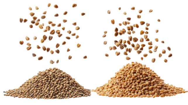 Two piles of fenugreek seeds and caraway seeds falling in the air on transparent background