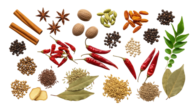 Top View Collection of Assorted Whole Indian Spices and Herbs isolated PNG with Transparent Background