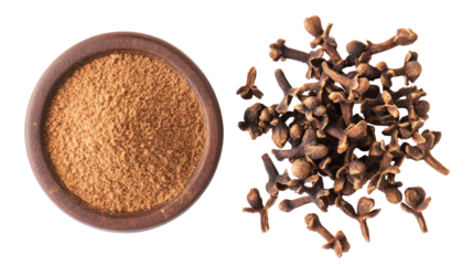 Bowl of fenugreek seeds next to dried cloves isolated on transparent background