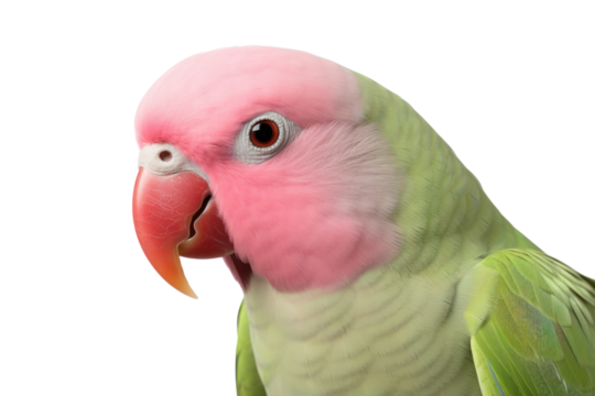 High-resolution close-up of a feral female Rose-Ringed Parakeet, isolated on white background