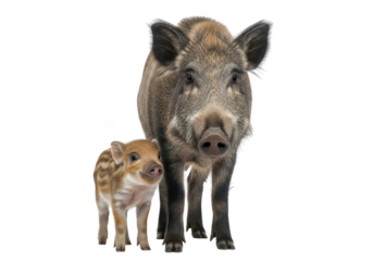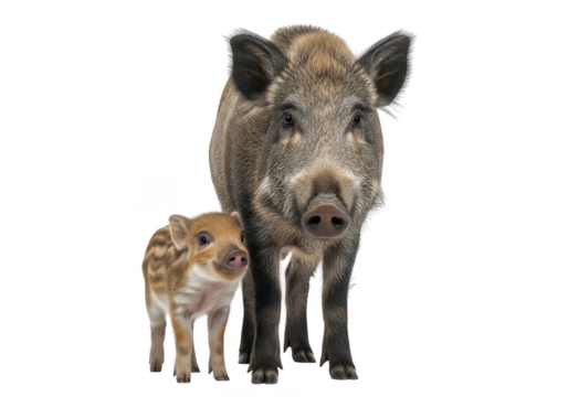 Wild boar mother and baby piglet, hog, swine, pig, feral pig, sow, young, wildlife, animal isolated on transparent background