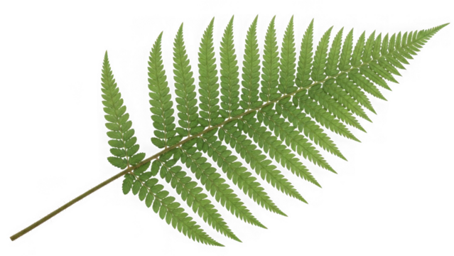 Isolated fern frond on plain backdrop with curved stem and vivid green pinnules for botanical art