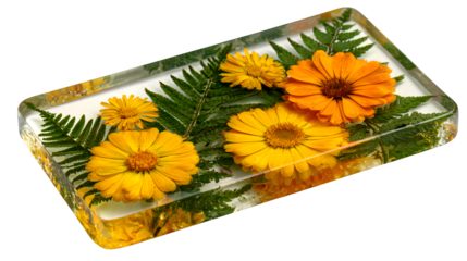 A rectangular resin coaster set with embedded, vibrant yellow calendula petals and contrasting dark green fern leaves, creating a lively and natural design for tabletop use