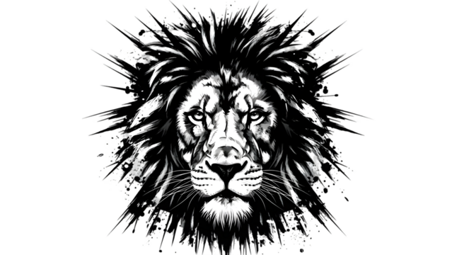 A black and white illustration of a lions face with a splash of ink around it isolated on transparent background