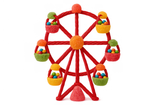 Candy land amusement park ferris wheel made from sweet gummy licorice and colorful sugar-coated confectionery on transparent background