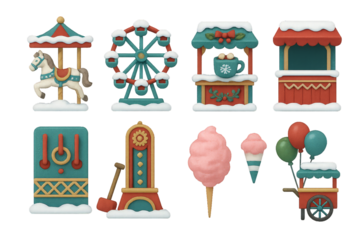 Festive winter fair scene with carnival rides, food stalls, and holiday decorations featuring colorful snow-covered elements