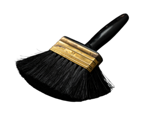 Black paint brush with a brass ferrule and black handle sits against a black background