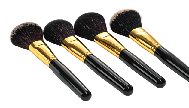 Four makeup brushes angled on a black background, with black handles and gold ferrules