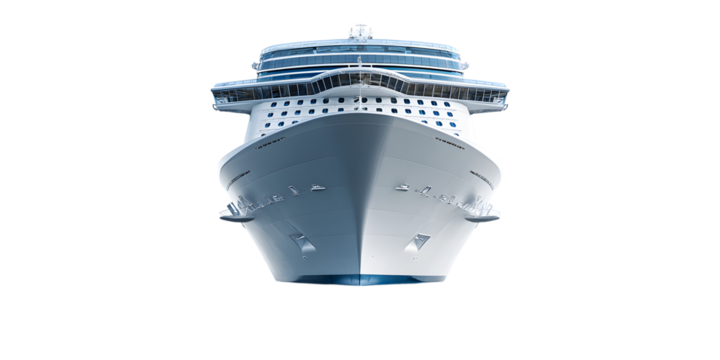 Front view of a large modern cruise ship against a stark black background