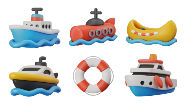 A charming collection of stylized 3d cartoon maritime icons including various boats, a submarine, and a safety lifebuoy on transparent background