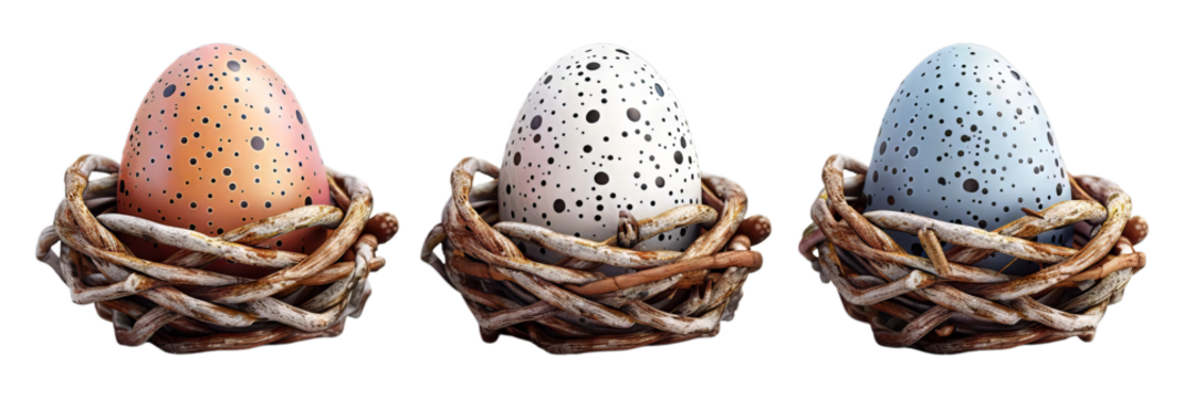 Colorful speckled eggs in woven nests isolated on transparent background. Easter decoration, spring symbol. Greeting card design for Easter holiday and nature theme