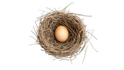 A solitary brown egg nestled in a natural twig nest. set against a clean white background. symbolizing new beginnings and potential. ideal for themes of nature. growth. and life