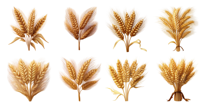 Various Golden Wheat Sheaves and Ears for Agricultural Themes, PNG bundle collection, Isolated on Transparent Background