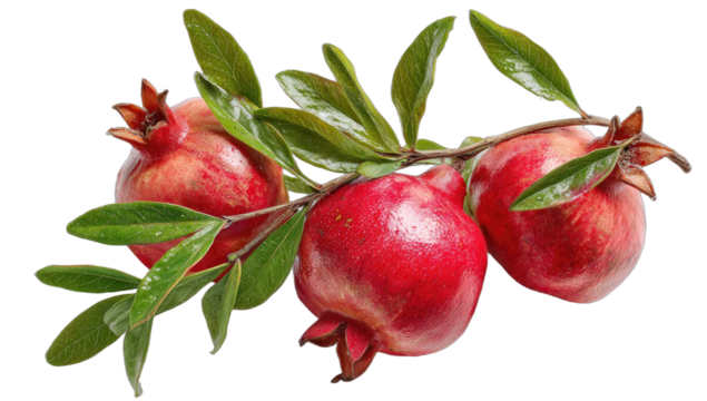 A trio of ripe, ruby-red pomegranates on a leafy branch
