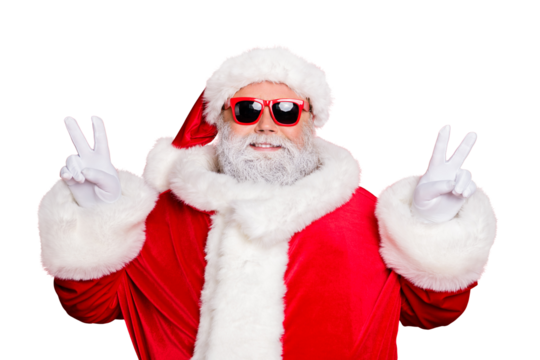 Close-up portrait of his he nice attractive cheerful cheery peaceful bearded Santa showing double v-sgn festive festal mood isolated over bright vivid shine red background