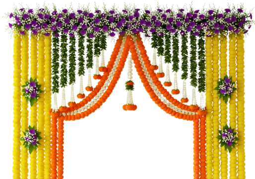 Vibrant indian wedding or festival decoration with flowers and beads isolated on transparent background