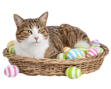 Cat basket Easter egg striped colorful animal pet playful relaxed holiday. relaxed tabby cat lies woven basket surrounded by colorful striped Easter eggs creating playful and festive holiday