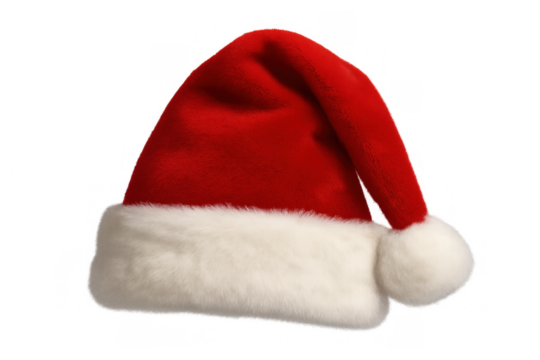 Santa claus hat, red and white christmas cap with faux fur and pompom, seasonal festive attire on transparent background