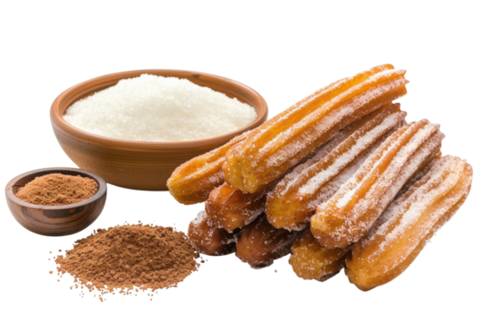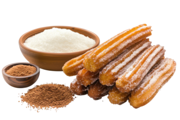 Delightful churros dusted with sugar and spices arranged with bowls of sweet toppings isolated on transparent background