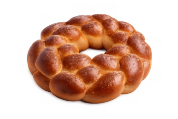 Challah bread wreath for rosh hashanah, traditional braided round loaf, baked golden brown, transparent background