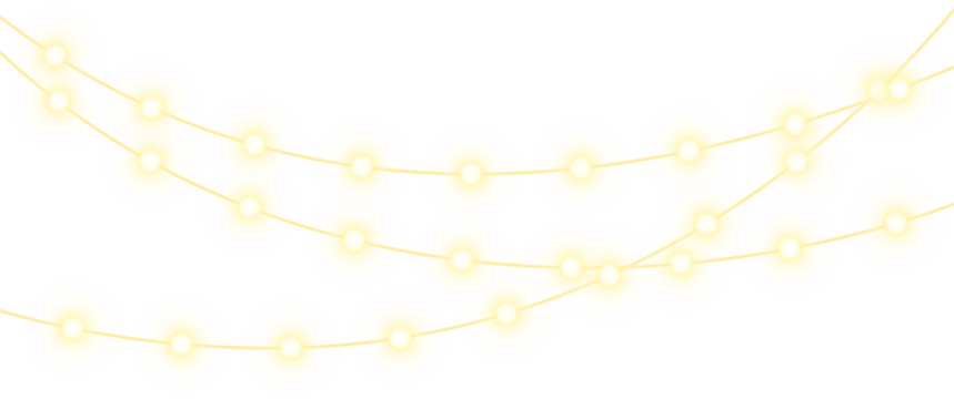 Christmas garland lights glow in cozy golden tones. Bulbs on wire shine softly for holiday atmosphere. Transparent background fits digital banners and UI. Festive vector set includes curved strands