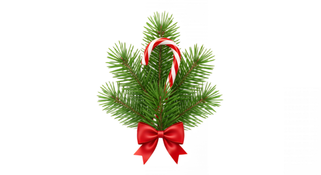 Christmas festive arrangement with pine branches, red berries, candy cane, and a red bow on transparent background