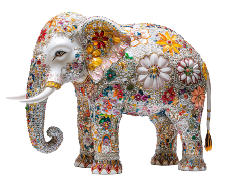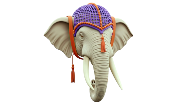 Decorated elephant adorned with colorful garments and accessories, perfect for festive celebrations and cultural events.