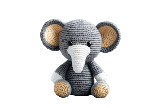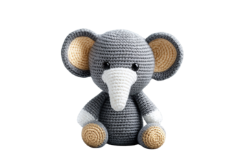 Crochet Gray Elephant Plush Toy Sitting on Transparent Background