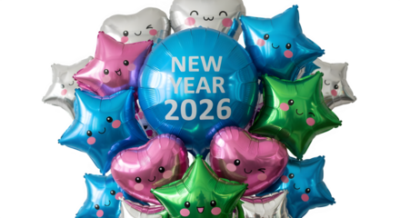 Happy new year 2026 balloons in festive shapes isolated on transparent background