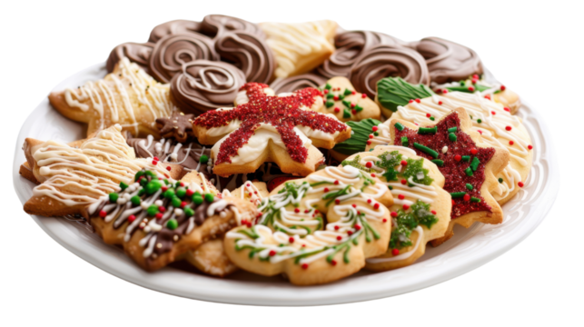 Plate of Thanksgiving dinner featuring turkey slices, roasted potatoes, cranberry sauce, mashed potatoes, and asparagus isolated on white transparent background. Concept of festive meal