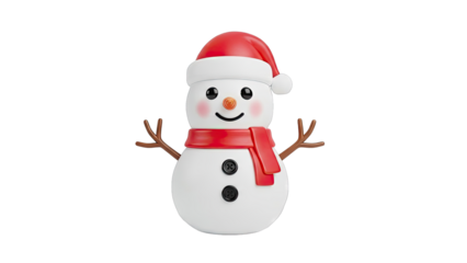 Happy snowman wearing a red hat and scarf isolated on transparent background