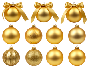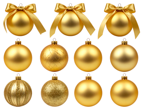 Twelve gold Christmas ornaments with various textures and bows