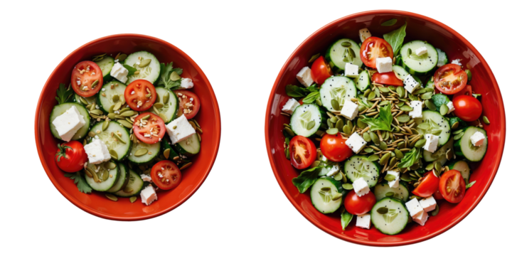 Organic vegetable salad featuring tomatoes, cucumbers, mixed greens, seeds, and feta cheese served in two red bowls against a transparent background with ample copy space.